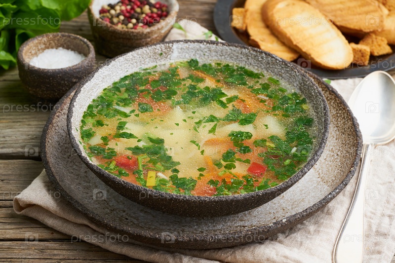 Деревенский куриный суп с гарниром, петрушкой, овощами, домашнее блюдо на старом темном столе, вид сбоку