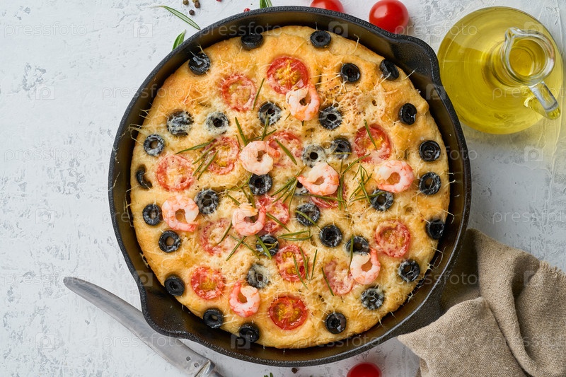 Фокачча, пицца с креветками на сковороде, итальянская лепешка с помидорами, оливками и розмарином. Вид сверху, пространство для копирования, белый бетонный фон