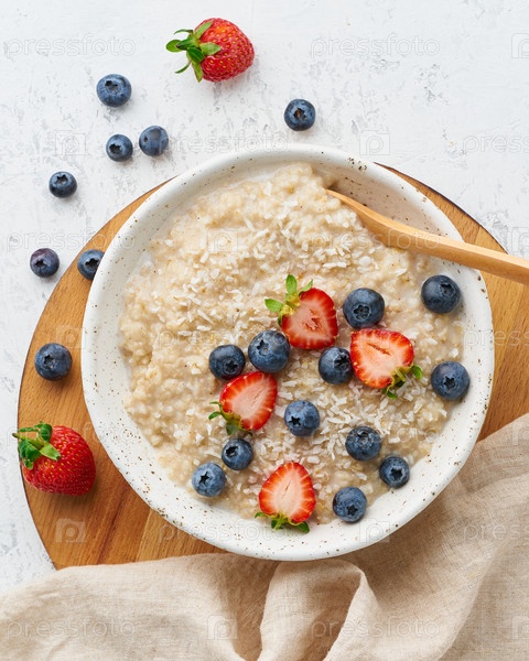 Овсяная каша деревенская с ягодами, диета Dash, на белом деревянном фоне вид сверху