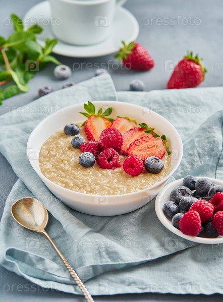 Овсянка с черникой, клубникой, малиной на синем темном фоне