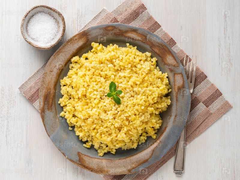 Булгур пшеничный. Вареный булгур в тарелке на белом деревянном столе. Здоровый вегетарианец