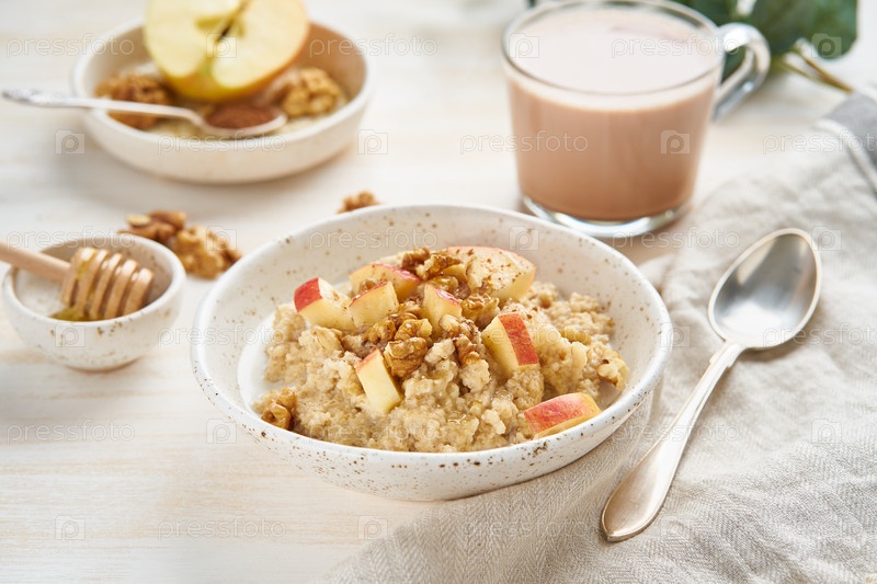 Овсянка с яблоком, грецкими орехами и чашкой какао на белом деревянном светлом фоне