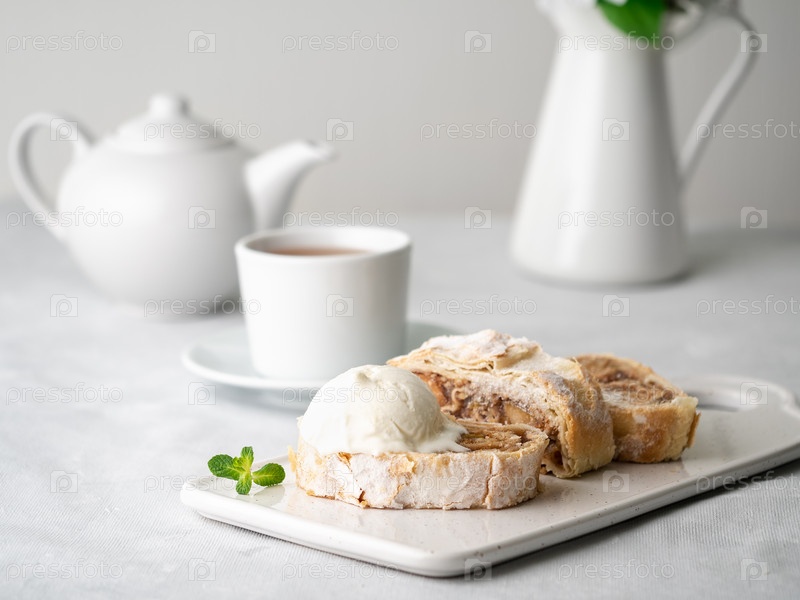 Яблочный штрудель с мороженым и корицей. Запеченный пирог и чай, вкусный десерт