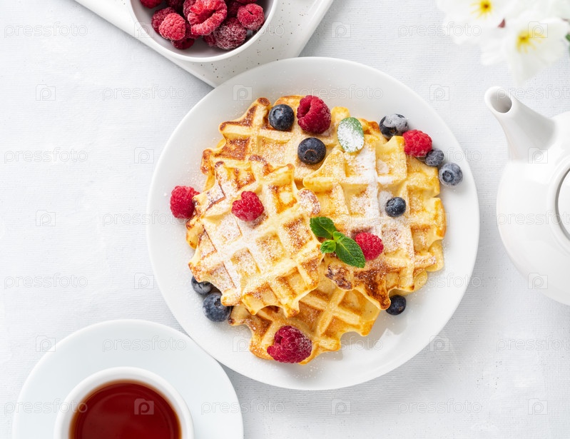 Бельгийские вафли с малиной, черникой, творогом и чаем, вид сверху. Здоровое домашнее