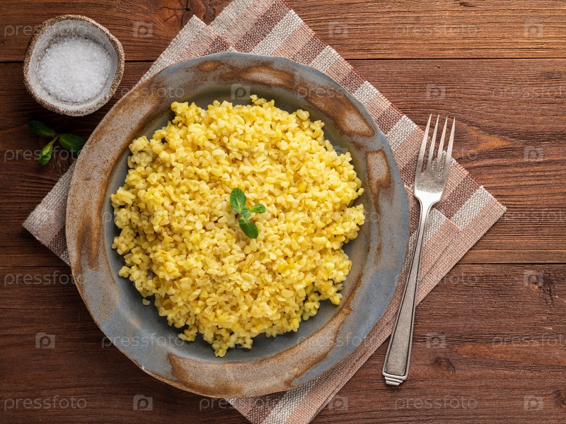 Булгур пшеничный. Вареный булгур в тарелке на коричневом деревянном столе. Здоровый вегетарианец