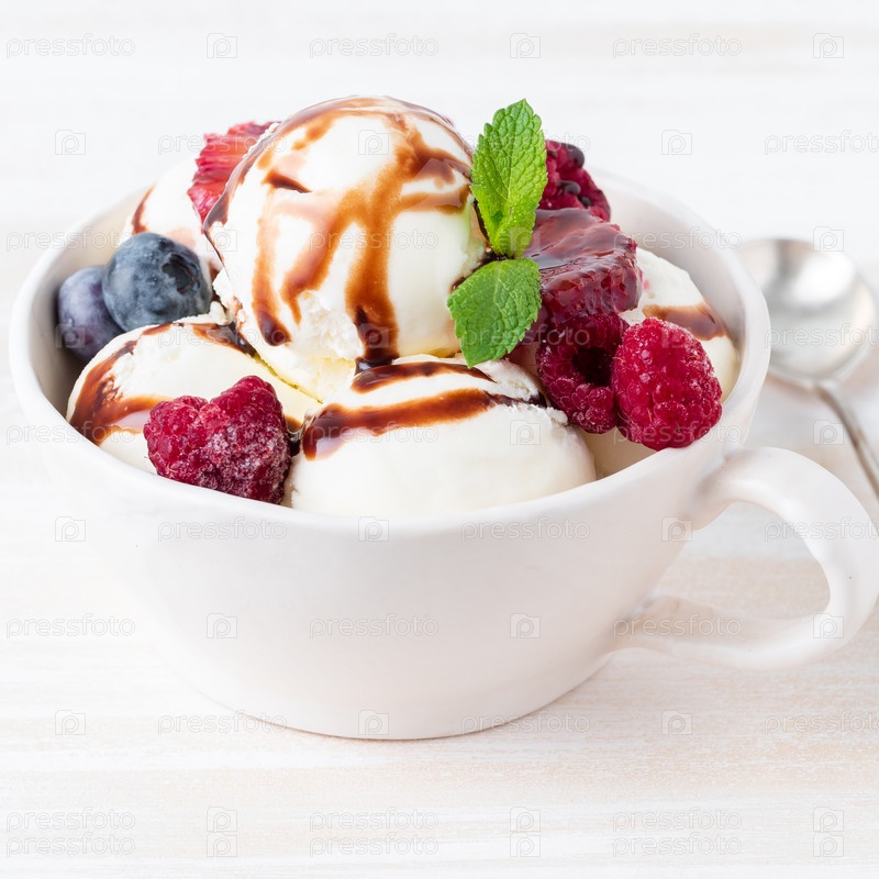 Шарики ванильного мороженого в кружке с малиной и черникой, шоколад