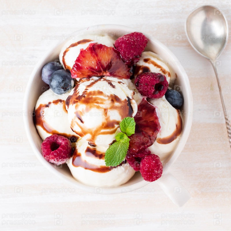 Шарики ванильного мороженого в кружке с малиной и черникой