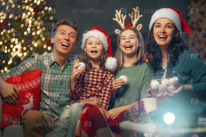 Семья смотрит праздничные фильмы дома