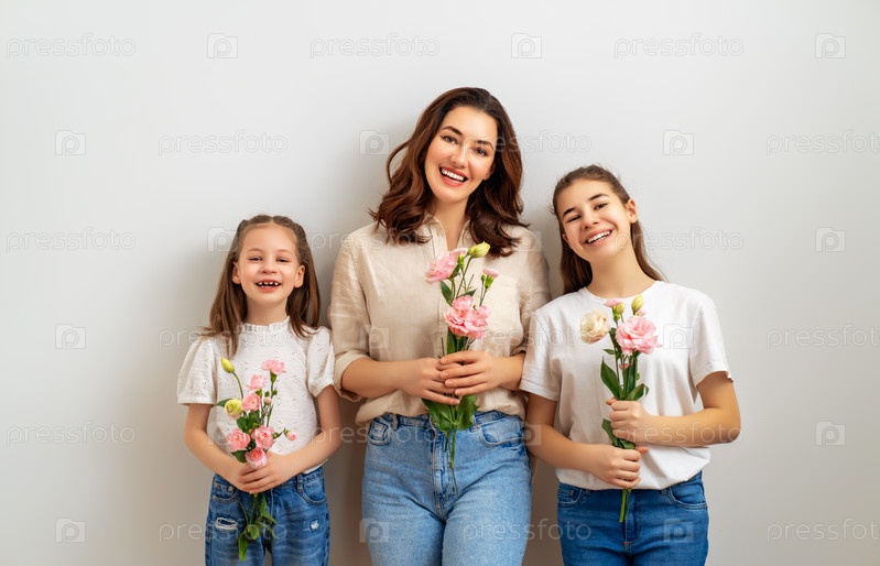С женским днем. Дети поздравляют маму и дарят ей розовые цветы. Мама и девочки улыбаются на светло-сером фоне. Семейный праздник и единение