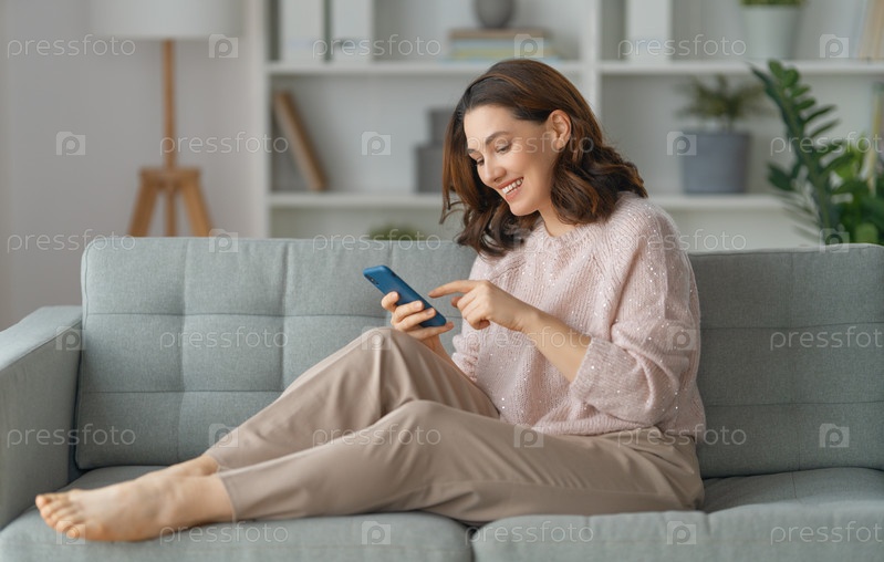 Женщина пользуется телефоном, сидя на диване