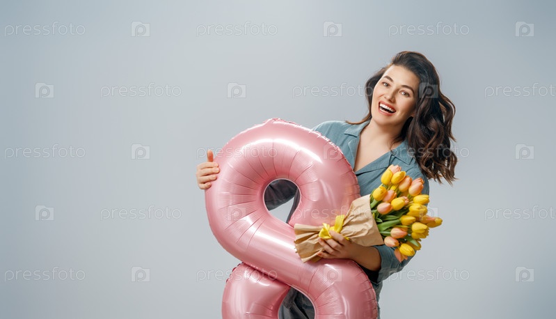 Женщина с цветами и воздушным шаром в форме восьмерки