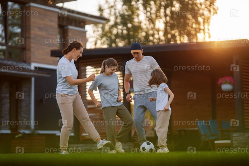 Счастливая семья играет в футбол