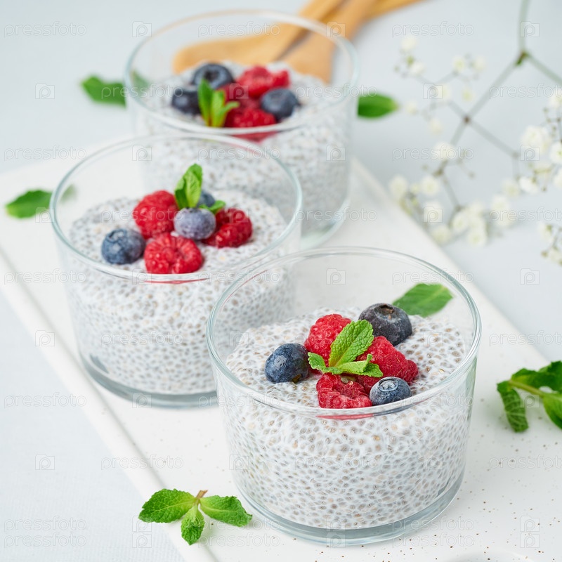Чиа-пудинг со свежими ягодами малиной, черникой. Три стакана, светлый фон, вид сбоку, цветы, крупный план