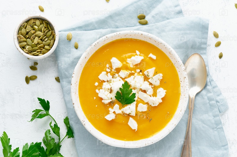 Крем-суп из тыквы с сыром фета, осенняя домашняя еда, белый фон, вид сверху