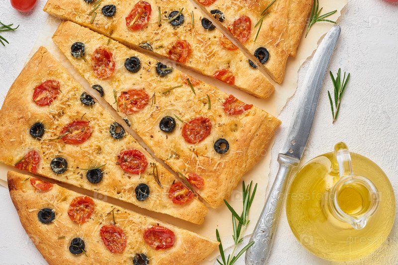 Фокачча с томатами, оливками и розмарином, вид сбоку. Традиционная итальянская лепешка