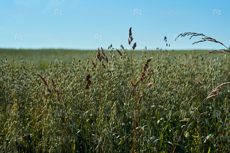 Поле с зелеными колосьями овса на фоне голубого неба в солнечный день, сельское хозяйство