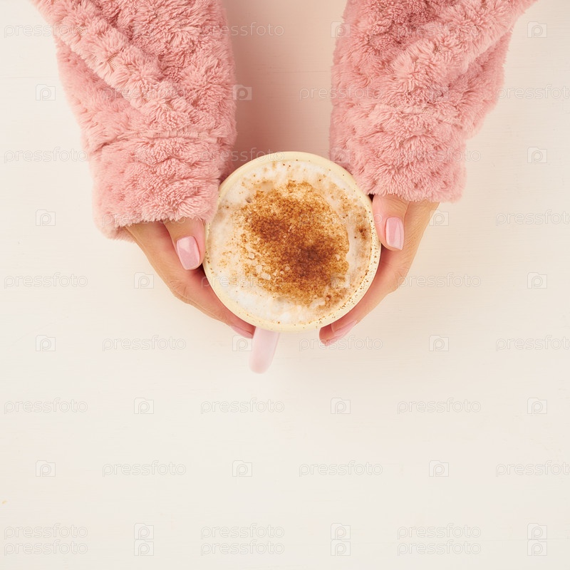 Утренний горячий кофе холодным осенним утром, руки держат кружку с напитком, уютная атмосфера, вид сверху, пространство для копирования