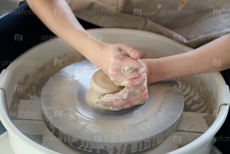 Женщина изготавливает керамическую посуду на гончарном круге, руки крупным планом, фокус на гончарах, ладони с глиняной посудой