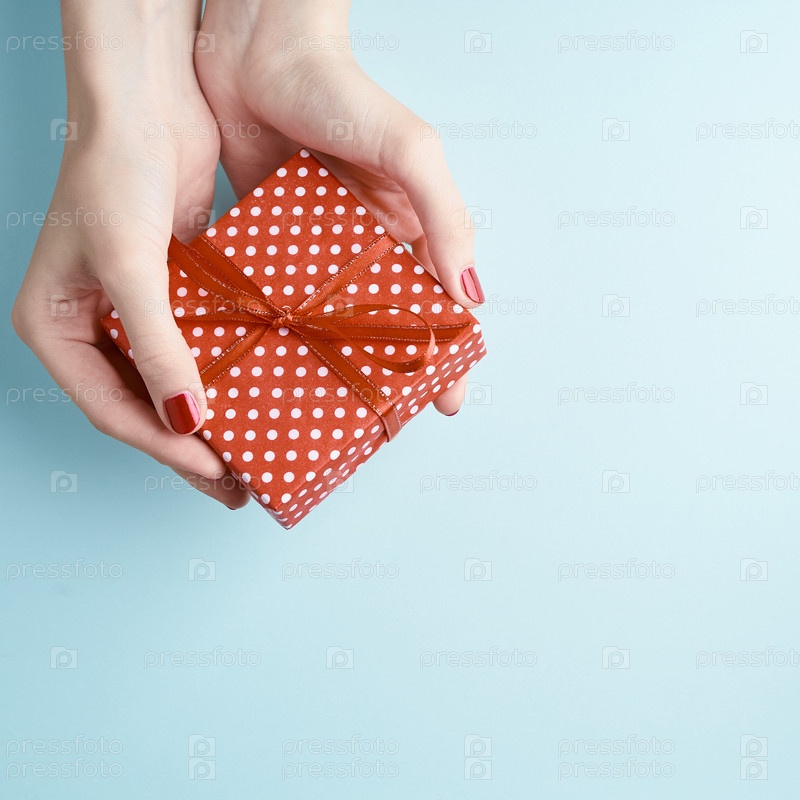 Руки женщины держат красный подарок с лентой, ухоженные руки с лаком для ногтей