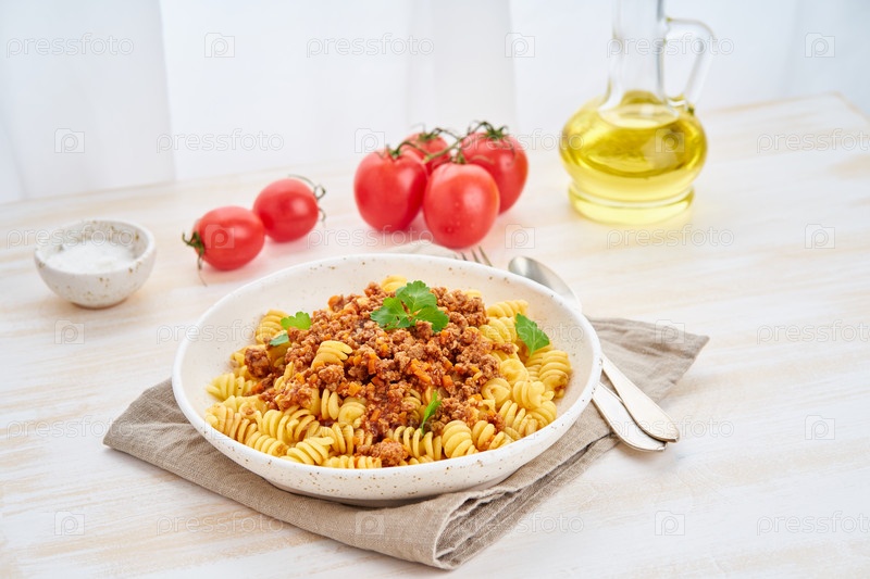 Паста Болоньезе. Фузилли с томатным соусом, рубленая говядина. Традиционная итальянская кухня