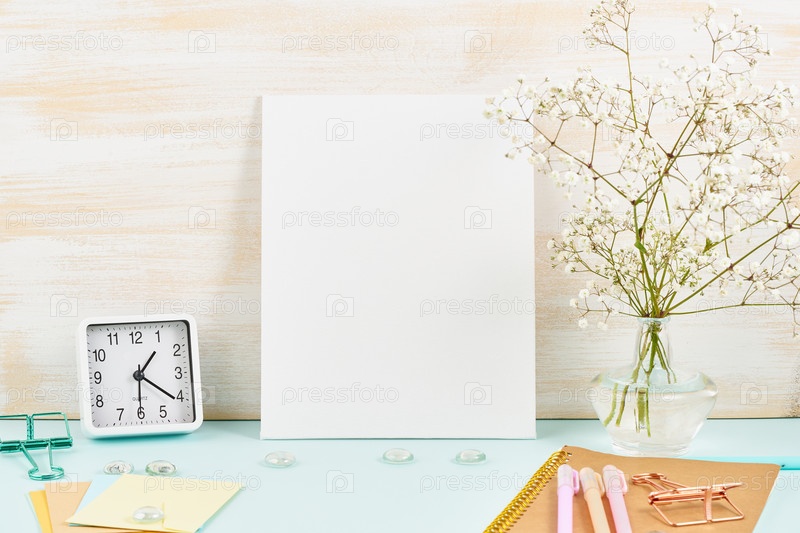 Макет с пустой белой рамкой на синем столе на фоне деревянной стены, будильник, цветок в вазе