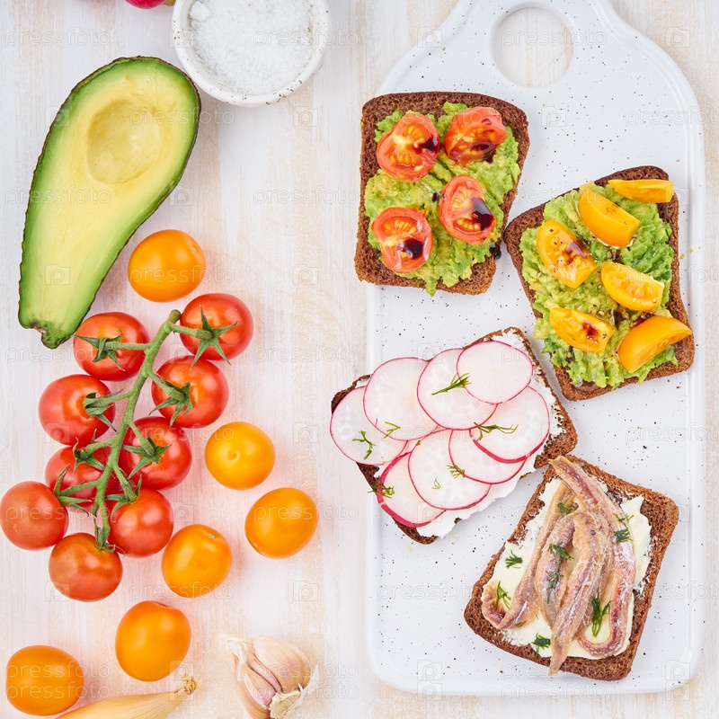 Набор сморребродов с рыбой, анчоусами, авокадо, помидорами, редисом