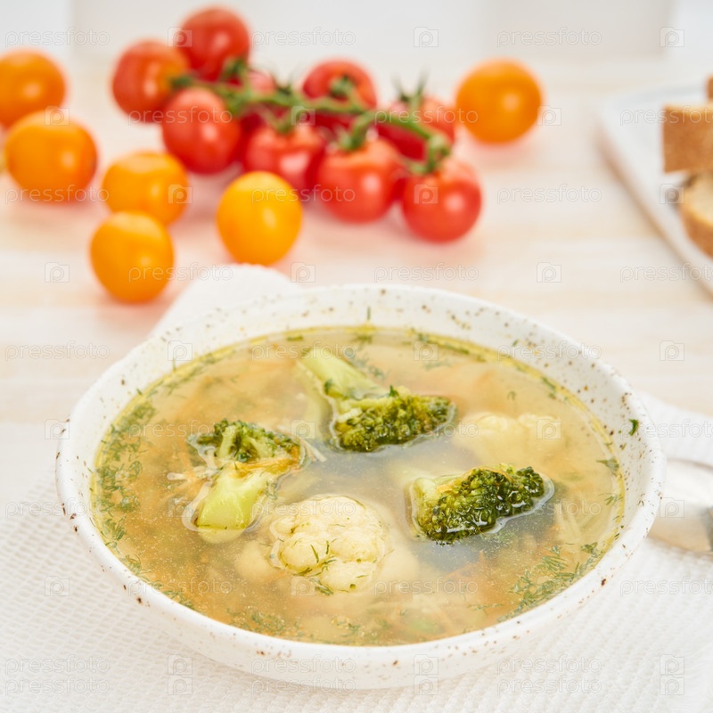 Суп из брокколи, полезное весеннее овощное диетическое вегетарианское блюдо, вид сверху, крупный план, вид сбоку