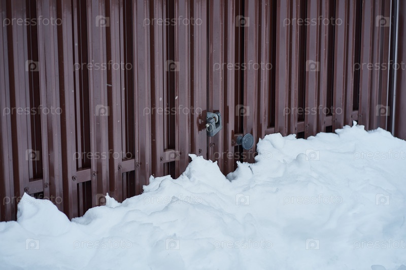 Металлический забор и снег в сельской местности, ворота с замком, вид сбоку