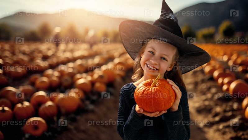 Девочка с оранжевыми тыквами на Хэллоуин в поле