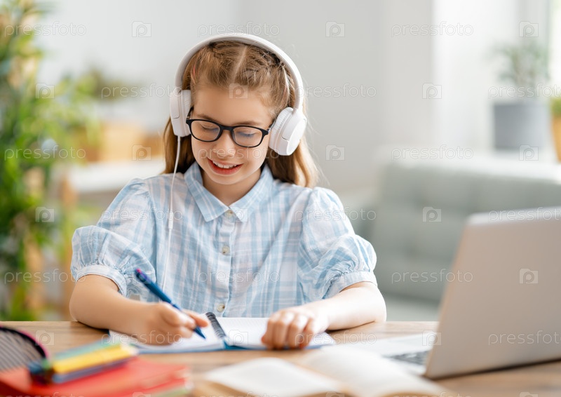Девочка выполняет домашнее задание или обучается онлайн