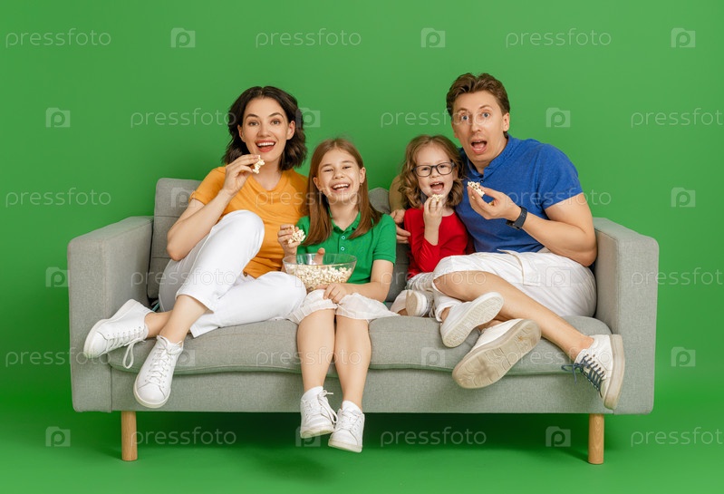 Счастливая любящая семья на ярком цветном фоне