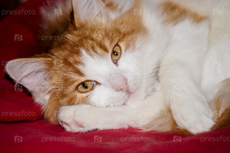Бело-рыжий кот с янтарным взглядом отдыхает на диване, положив свою лапку под голову