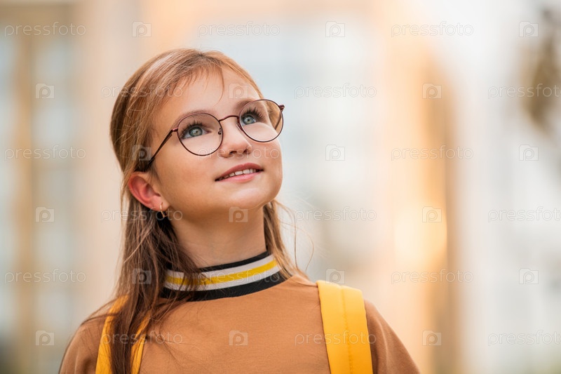 Портрет очаровательной светловолосой школьницы на улице крупным планом