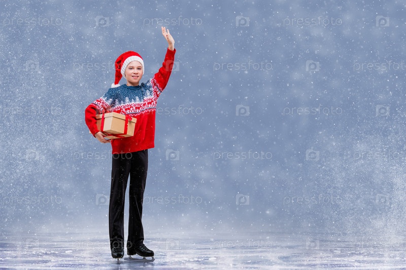 Мальчик-фигурист в шапке Санта-Клауса катается на льду. Зимние виды спорта для детей. Рождественская открытка с местом для копирования