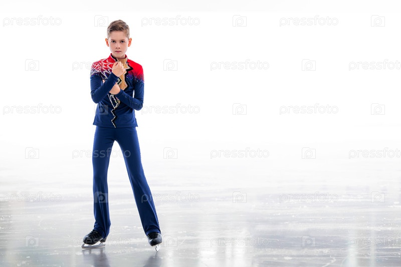 Мальчик-фигурист катается на льду. Изолирован на белом фоне
