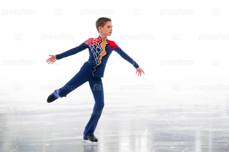 Мальчик-скейпер катается на льду, изолированный на белом фоне в спортивном костюме.Зимние виды спорта для детей