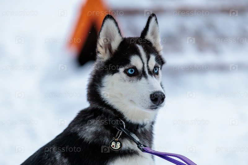 Собака породы хаски с голубыми глазами на фоне зимнего пейзажа