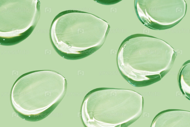 Текстура геля глицерина. Прозрачные капли сыворотки на зеленом фоне. Жидкий гель-увлажнитель с пузырьками макро. узор