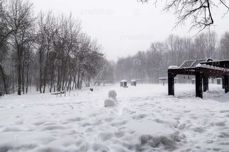 Снегопад в в парке. Заснеженные деревья и скамейки