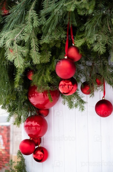 Большие красные сверкающие рождественские шары крупным планом на зеленой рождественской елке Рождественские уличные украшения