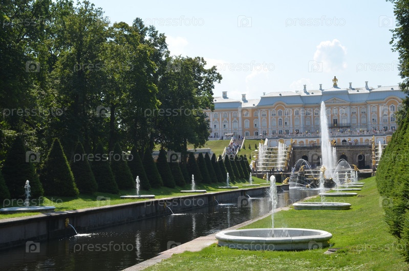 Морской канал, Большой петергофский дворец и Большой фонтанный каскад в Нижнем парке Государственного музея-заповеднига Петергоф в Санкт-Петербурге в ясный летний день