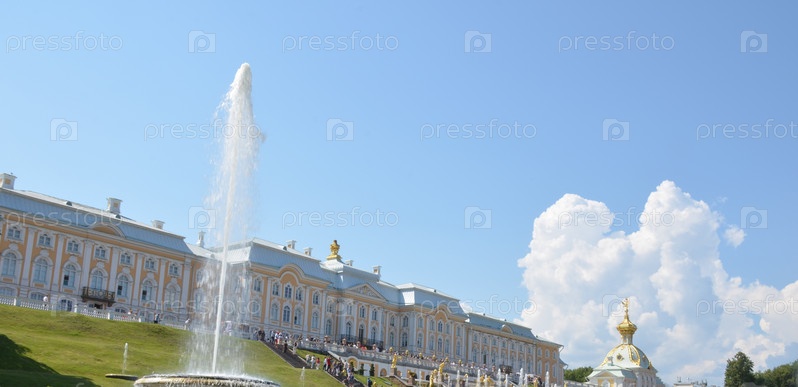 Вид на Большой Петергофский дворец и фонтаны Большого каскада каскад в Нижнем парке Государственного музея-заповедника Петергоф в Санкт-Петербурге