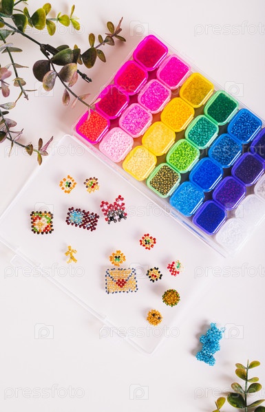 Коробка с разноцветными бусинами и плетеными украшениями и игрушками на столешнице и вертикальный вид