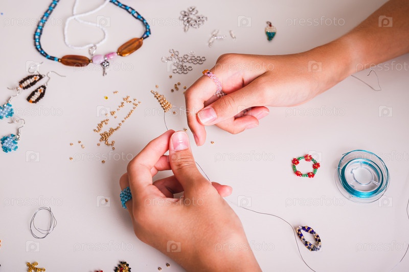 Руки девушки, плетущей бисерное украшение на рабочем столе с принадлежностями для бисероплетения