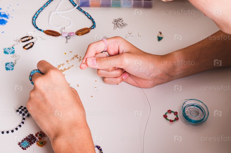 Девочка занимается бисероплетением на рабочем столе с помощью бисера и проволоки