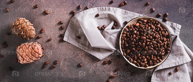 Неочищенные кедровые орехи на подносе и сосновые шишки на столешнице просмотр веб-баннера