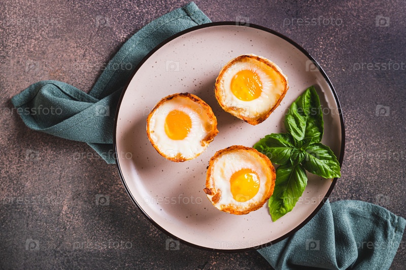 Крупный план куриных яиц, запеченных в беконе и листьях базилика на тарелке на столешнице