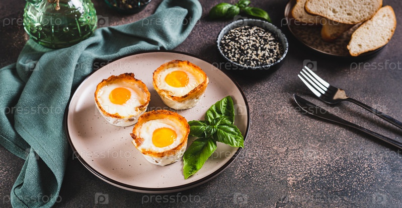Куриные яйца, запеченные в беконе и листьях базилика на тарелке на столе веб-баннер