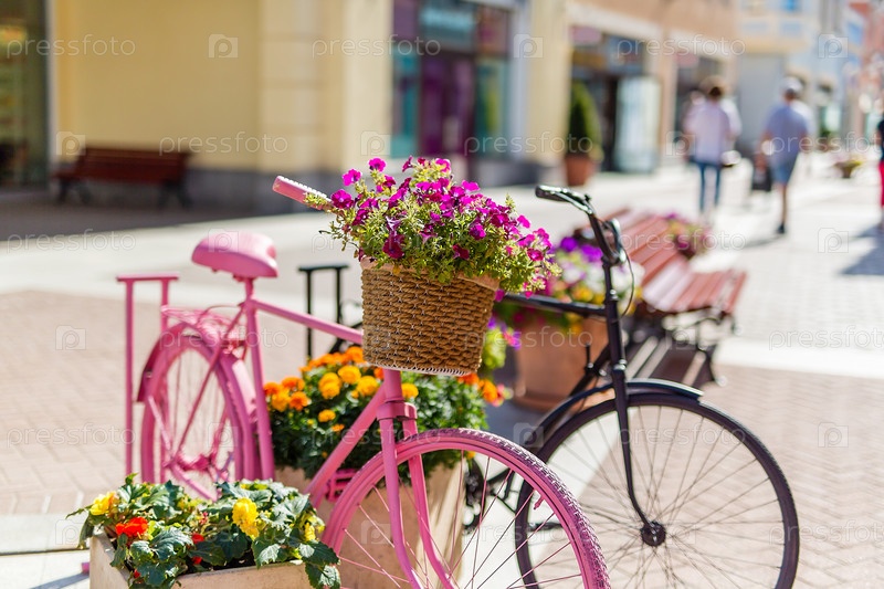 Европейские уличные магазины, клумбы цветов, украшение велосипедами, Солнечный день, шоппинг