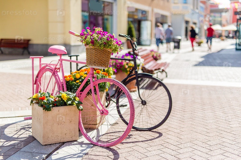 Европейские уличные магазины, клумбы цветов, украшение велосипедами, Солнечный день, улица с магазинами